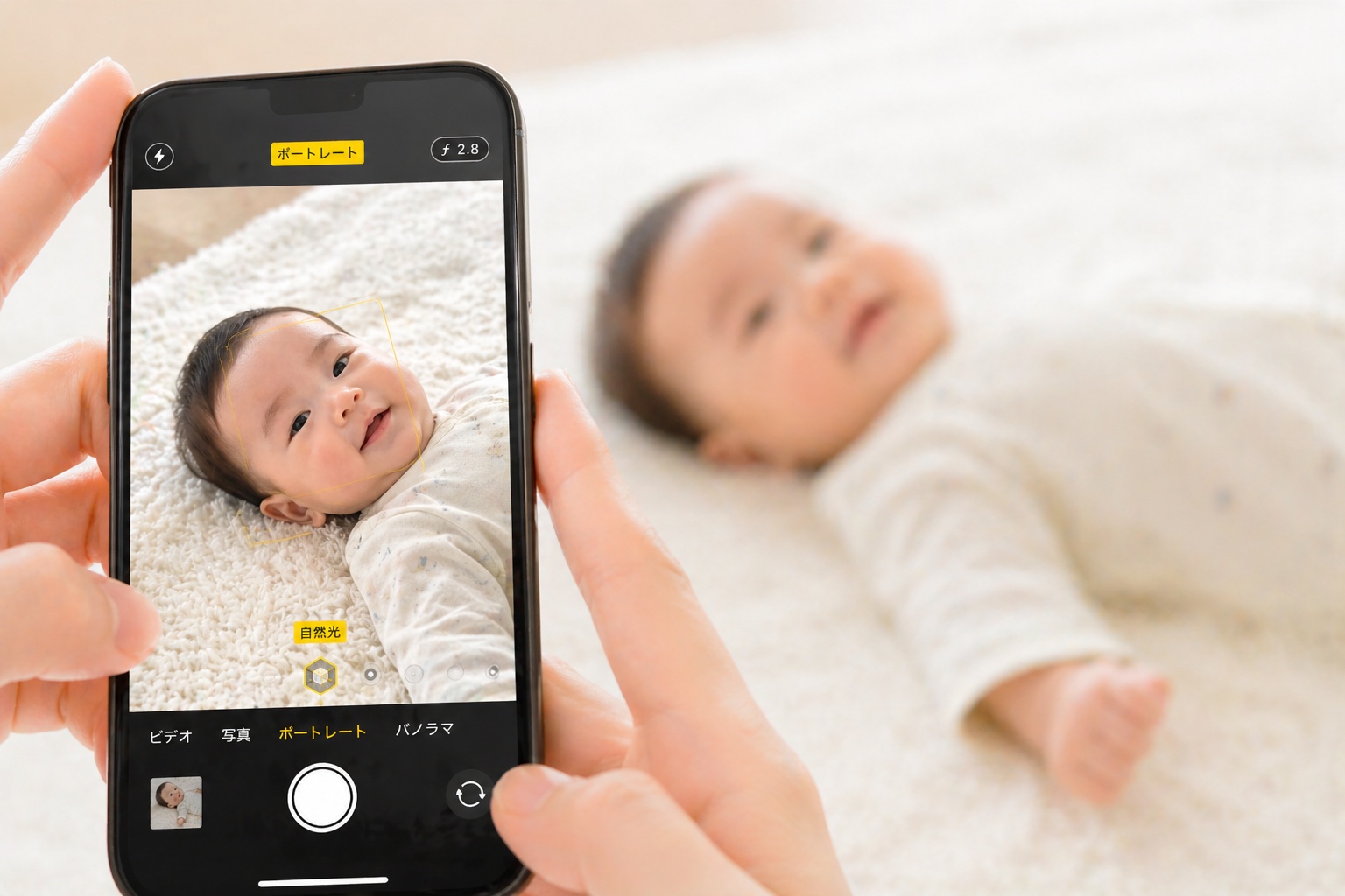 ポートレートモードは、被写体(赤ちゃん)をくっきり写して背景をぼかす機能です。「ボケ感」と呼ばれる表現で、一眼レフカメラのような雰囲気が出ます。