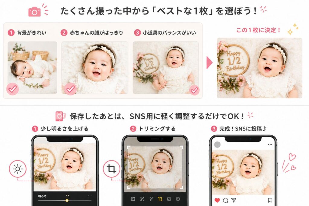 撮影お疲れ様でした!最後に、たくさん撮った写真の中から「これだ!」という一枚を選び、少しだけ魔法をかけましょう。